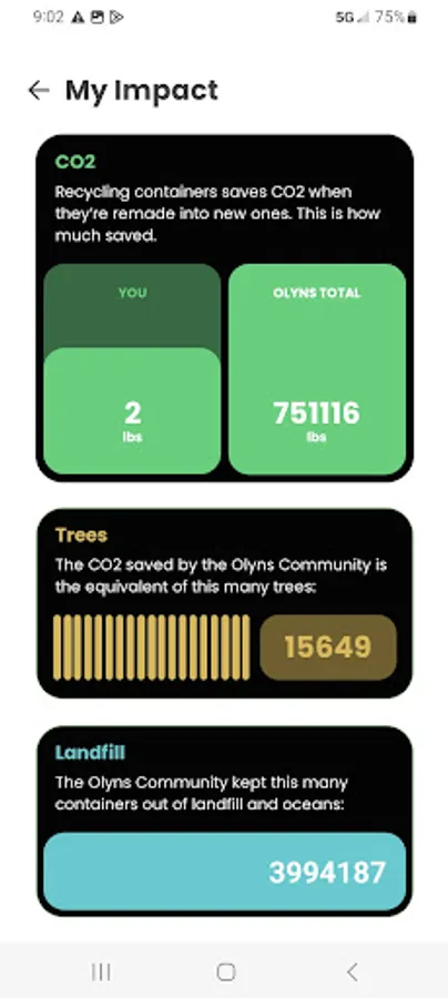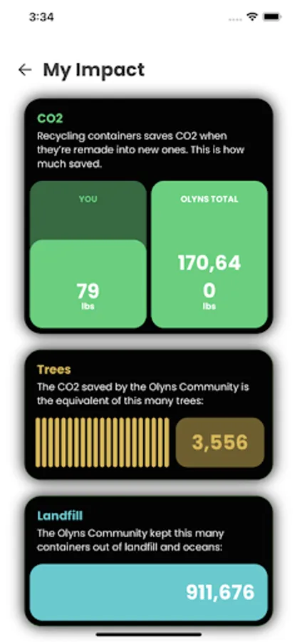 - See your lifetime eco-impact stats: # recycled containers, carbon (CO2) saved, and tree equivalents.