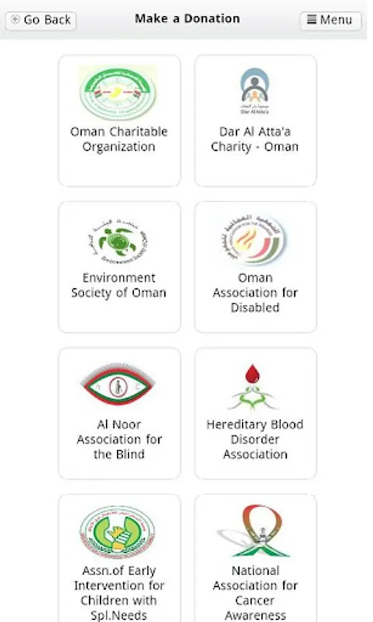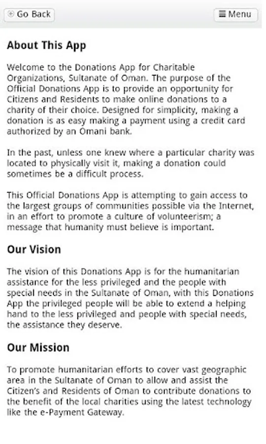 The Donations App has been developed with the vision to promote charity for valuable social causes in the Sultanate of Oman, by providing an electronic gateway in which to facilitate payment of donations to charitable organizations supported by the Ministry of Social Development.