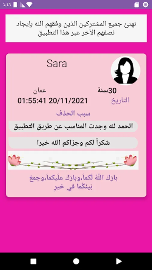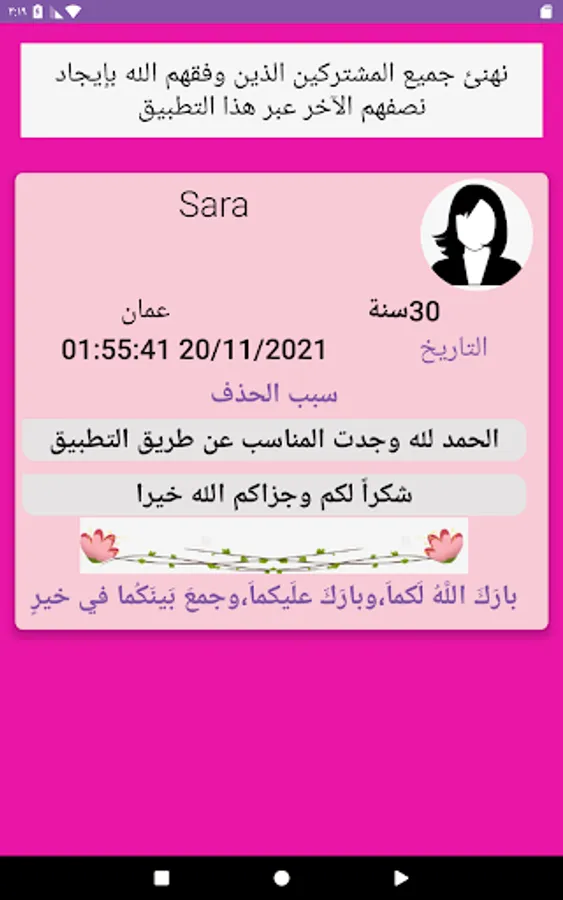 The “Marriage of Girls and Divorcees Oman” application is distinguished from other online marriage applications in that it takes care of the smallest details that care about your privacy and finds you the right person in a smart way to make its use a safe and reliable experience, and it is also based on compatibility, which means that its customized results agree between you and your potential future partner