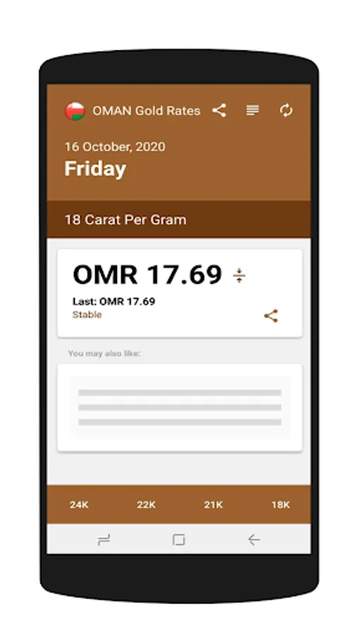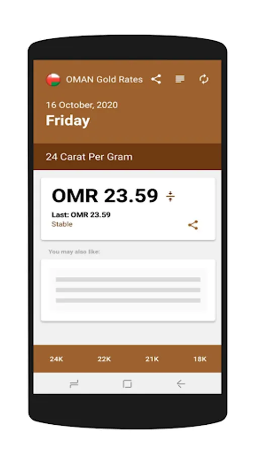 Display latest and live gold rates for 24, 22, 21 and 18 carat.