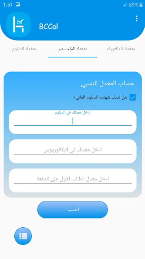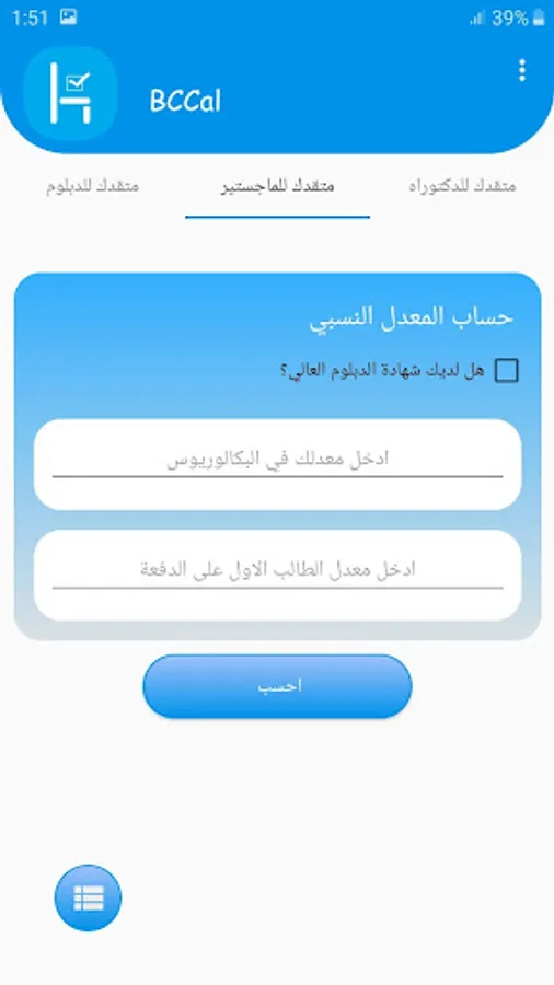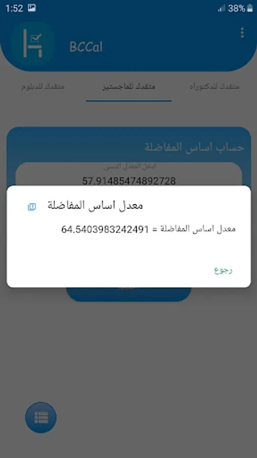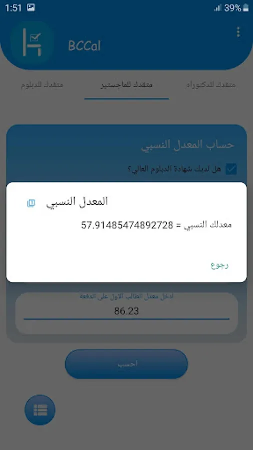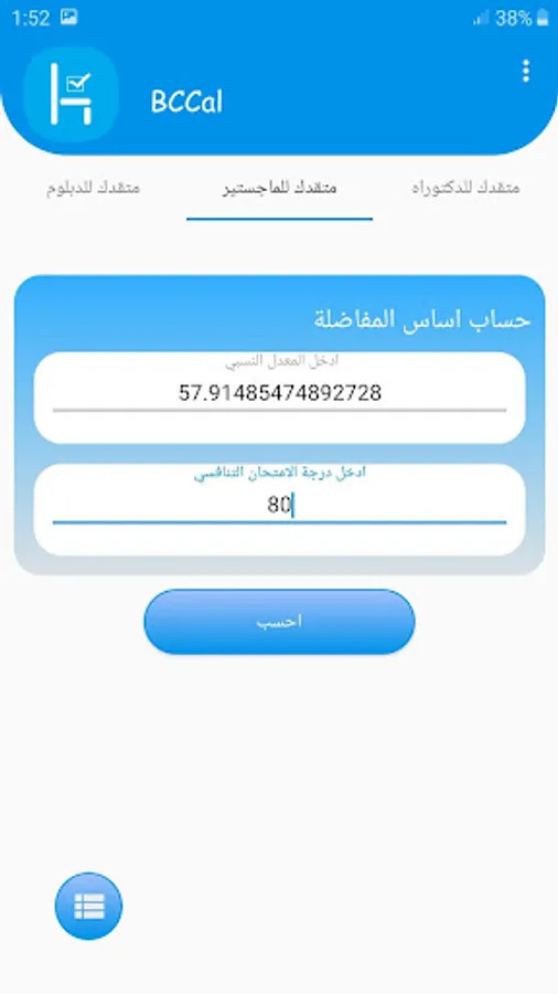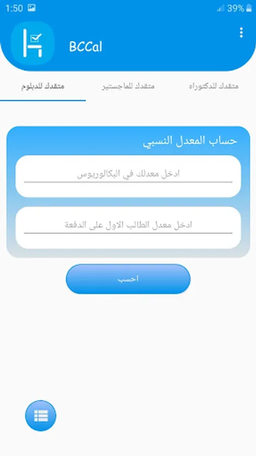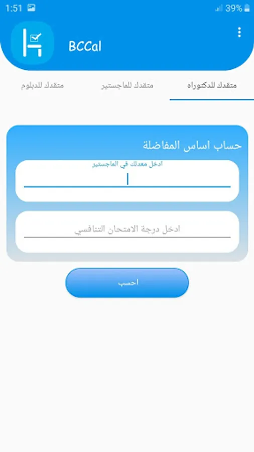 The application of Basic Competition Calculator (BCCal) is an application that calculates the required equations to find out the basis comparison rate, which is tested by the owners of high rates through it, this application was created for students who seek to complete their postgraduate studies such as masters, higher diplomas and doctorates in Iraqi universities.