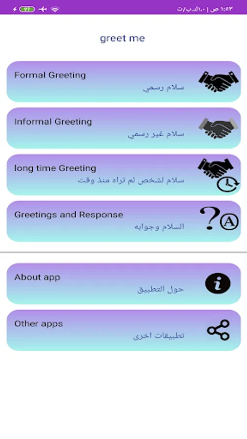 هذا التطبيق يحتوي على اغلب التاابير الشائعة المستخدمة في اداء السلام في كلا اللغتين العربية والانكليزية, يحتوي على التعابير الرسمية والتعابير في اللغة الدارجة, اللغة الدارجة المسخدمة في هذا التطبيق هي اللهجة البغدادية.