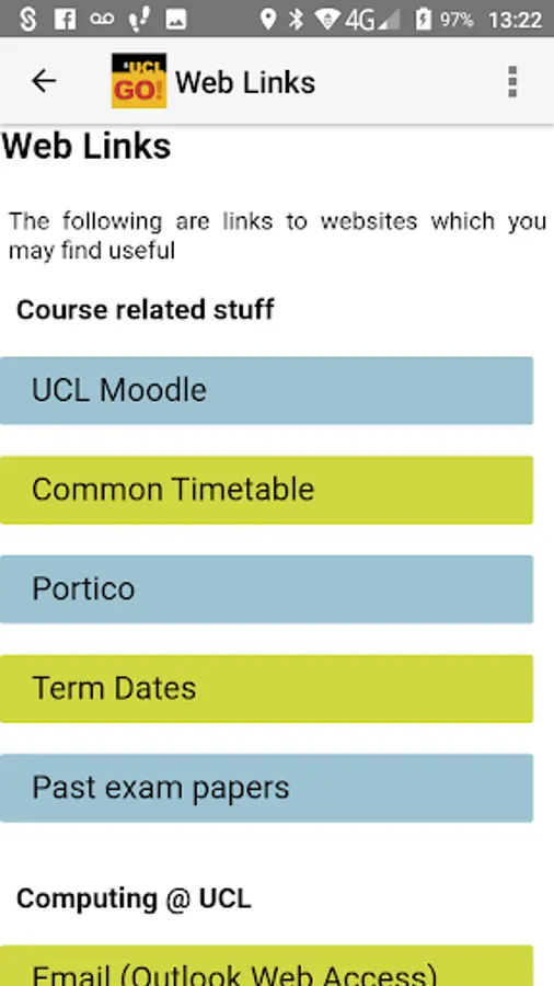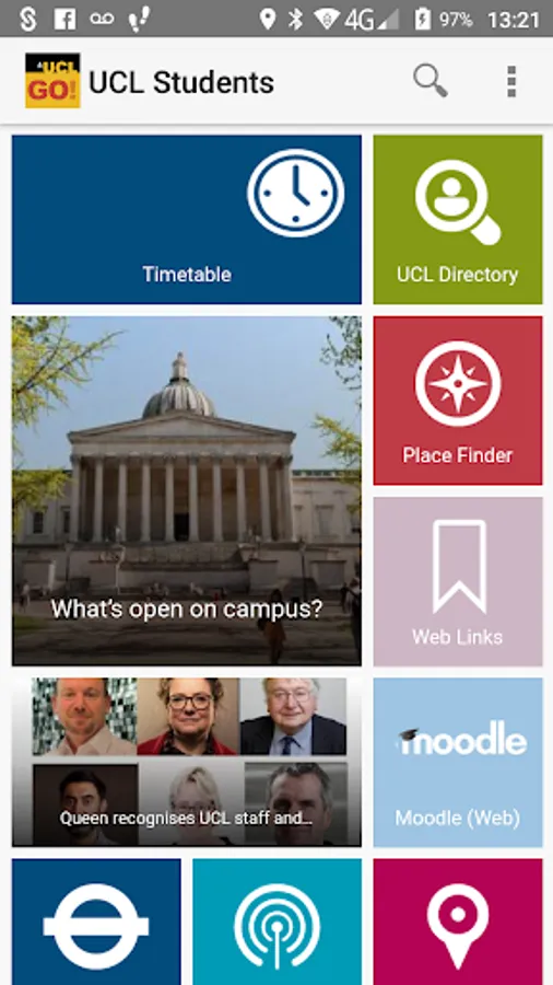 UCL Go is your companion at UCL. One-tap access to your timetable, email, the library and our learning environment (Moodle). Take a virtual tour. Discover what's on and how to get there. Opt-in to notifications about topics you find interesting. Get alerts about things you need to know. Get the most from your time at UCL. Get UCL Go.