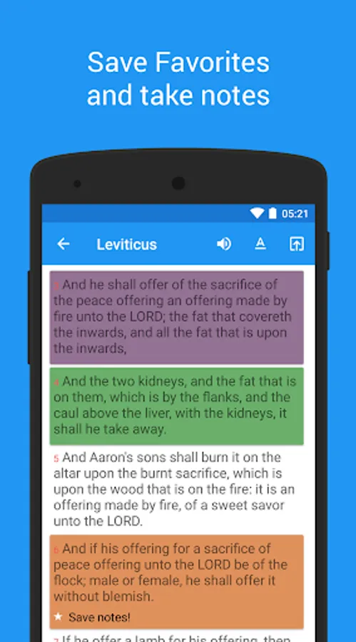 ★ Favorites; save and bookmark your favorite verses. Add colors to your bookmarks to easily categorize your favorites any way you wish. You can sort your bookmarks by color or by Bible books.