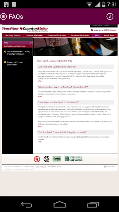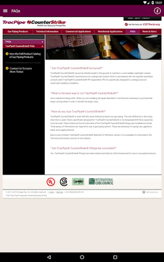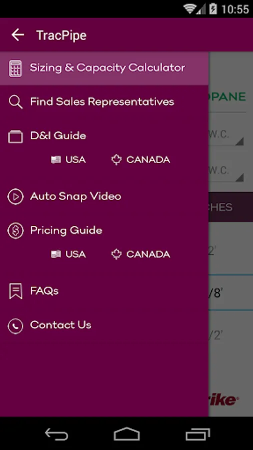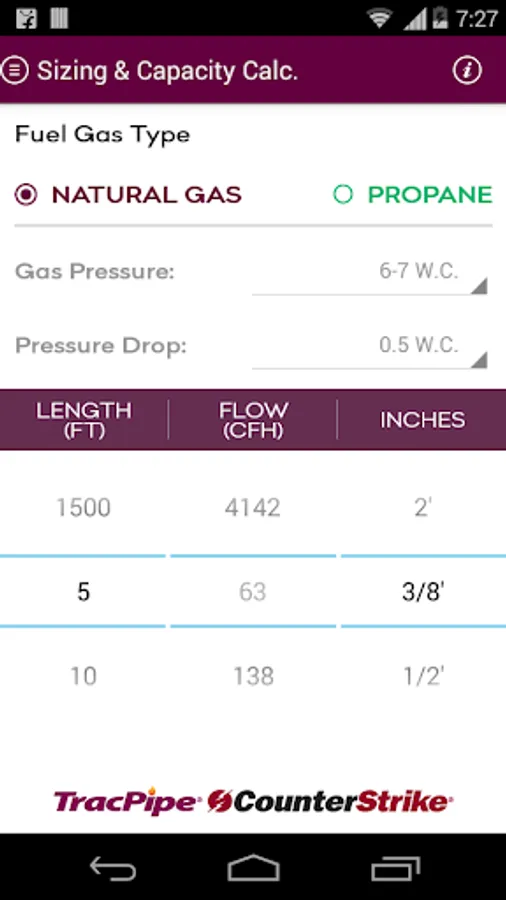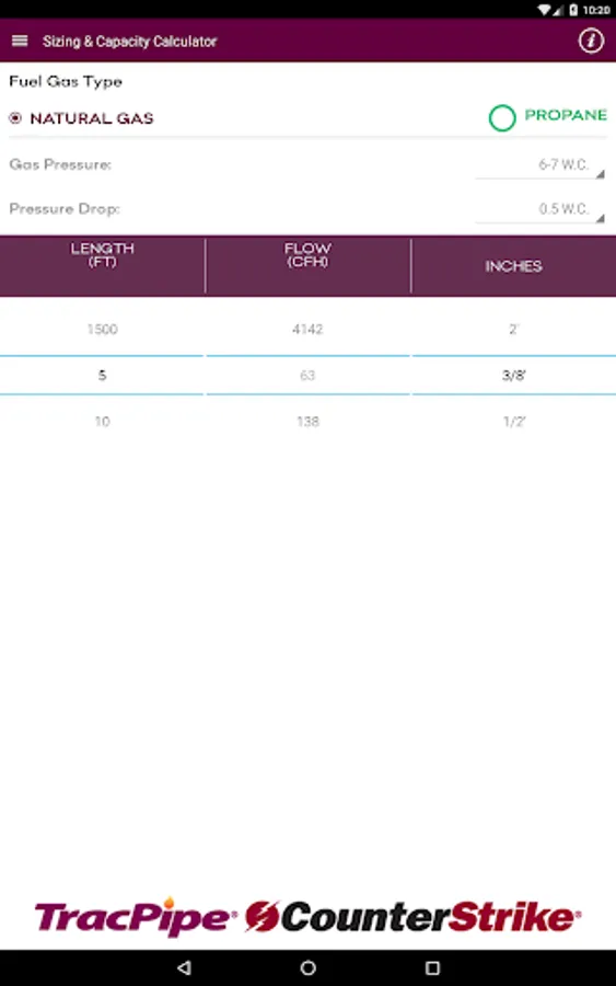 This App allows the user to size the TracPipe® Flexible Gas Piping products, to either the Longest Run or Branch length method of gas pipe sizing. Whether the installation is in TracPipe, PS-II or TracPipe CounterStrike® the App displays the appropriate size of piping for a given capacity depending on the type of gas, supply pressure and allowable pressure drop selected by the user. By selecting the design parameters using easy drop down menus the user then chooses the length of pipe and tubing size, on the easy to read calculator wheel, to find the capacity capable of being delivered by any of the seven sizes offered by TracPipe.