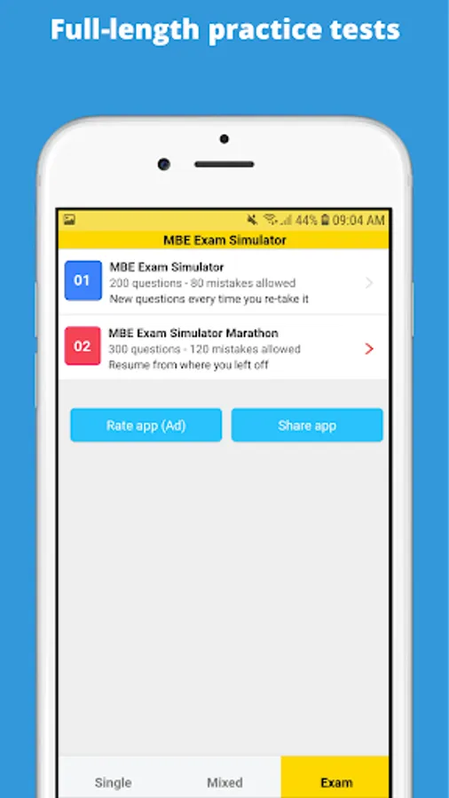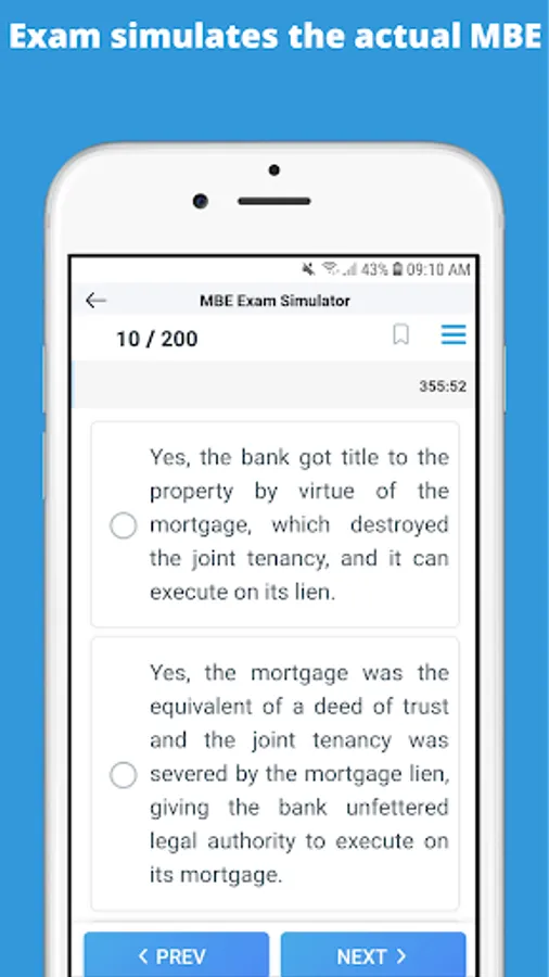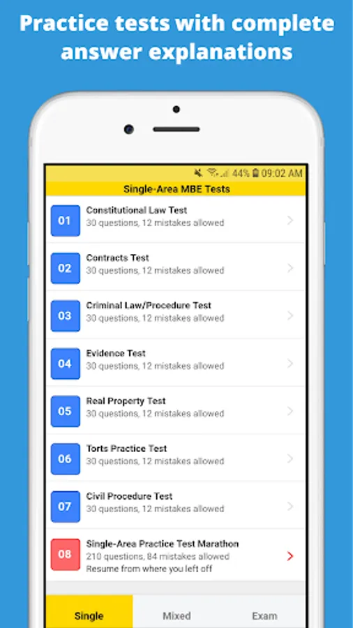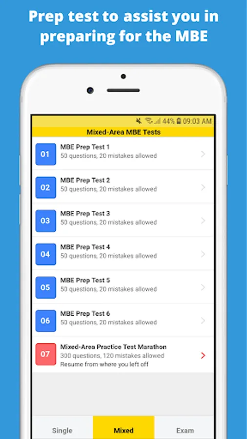 The Multistate Bar Examination (MBE) is a part of the Bar Exam. It is a standardized set of 200 multiple-choice questions (covers all seven legal practice areas: constitutional law, real property, criminal law and procedure, civil procedure, evidence, contracts, and torts) usually taken on the first day of the state bar examination. The National Conference of Bar Examiners (NCBE) prepares the test questions. The questions are administered in two sessions: 100 questions in the morning session and the remaining 100 questions in the afternoon session.