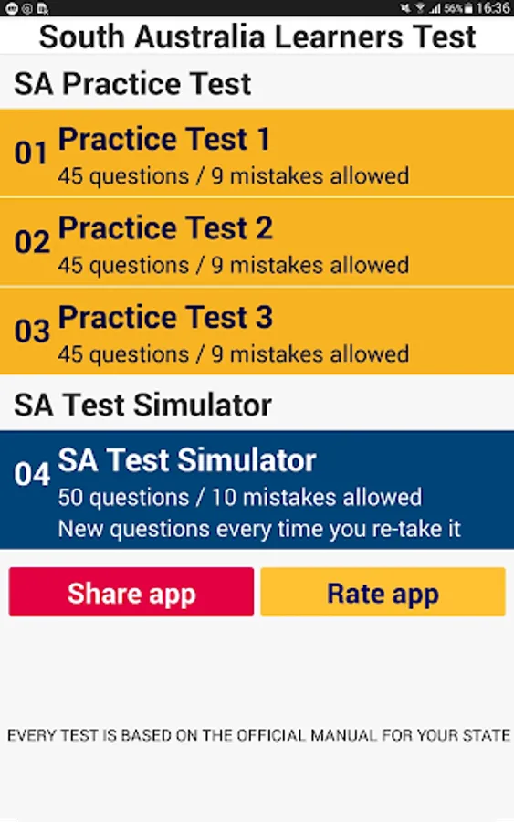 SA Learners Test is like to the real South Australia Learners Test. The questions are based directly from the official 2018 South Australia Driver’s Handbook.