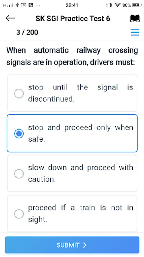 - The practice test contains 40 multiple-choice questions randomly chosen from a database of 200 questions that will help you to pass the Saskatchewan SGI Driving Test Easily.