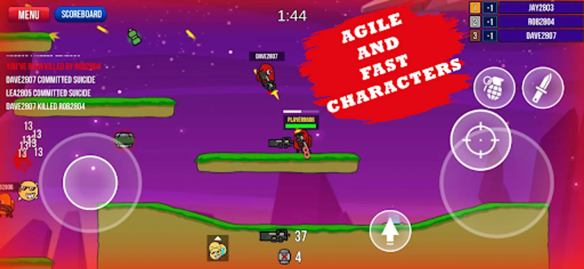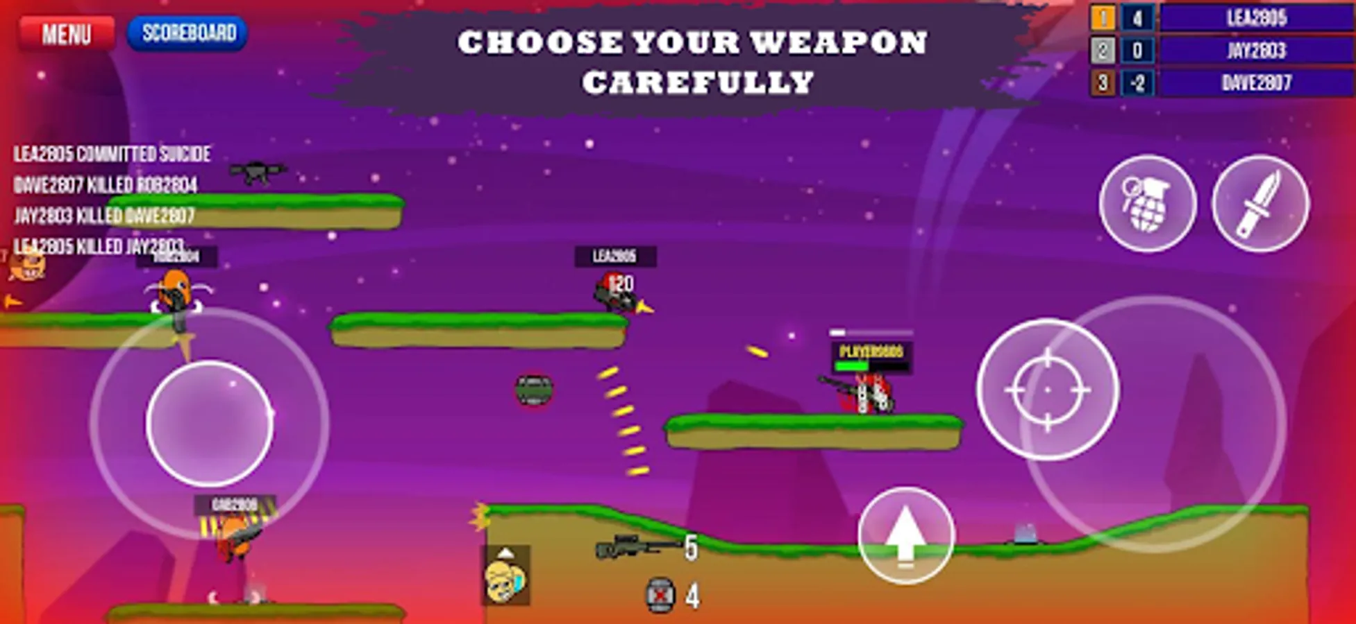 You can use different weapons in the game. You can show emojis to piss off your opponents. If there is more than one enemy, you can kill them en masse by using bombs. You can neutralize enemies at close range with the help of a knife. To rank high on the leaderboard, just killing enemies will not be enough. You will have to die in a small number. Each time you die, your score will decrease. In the game, you can fill your ammo by collecting bullets when you run out of magazines.
