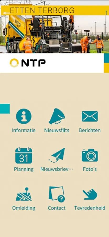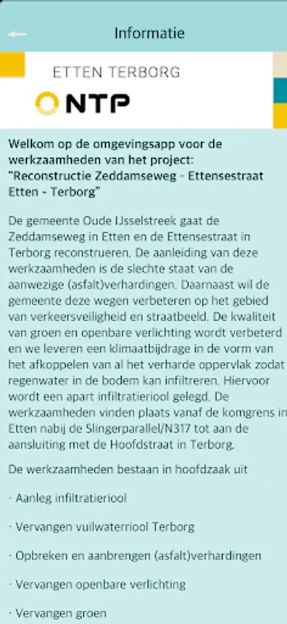 In this app you will find all information about the work of the project "Reconstruction Zeddamseweg – Ettensestraat Etten - Terborg" of NTP. Important project information, the latest schedule, and contact information are displayed . You can also leave questions, comments or complaints about the project on this app.