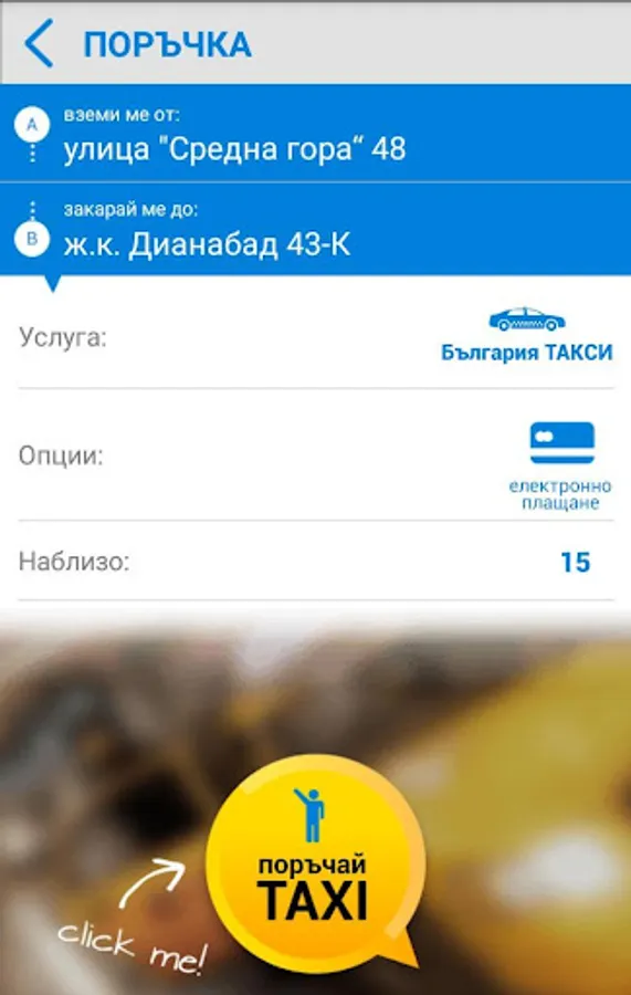 Click your taxi – in just seconds, without calling, only a few taps on your phone screen! More than 30 reliable taxi companies with over 2000 taxis in Sofia, Plovdiv, Burgas, Sliven, Haskovo, Ruse, Vratsa, Montana and Dupnica are ready to pick you up. The service is on trial in Varna, Pleven and Blagoevgrad.