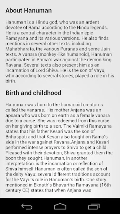 Hanuman is a Hindu god, who was an ardent devotee of Rama according to the Hindu legends. He is a central character in the Indian epic Ramayana and its various versions. He also finds mentions in several other texts, including Mahabharata, the various Puranas and some Jain texts. A vanara (monkey-like humanoid), Hanuman participated in Rama's war against the demon king Ravana. Several texts also present him as an incarnation of Lord Shiva. He is the son of Vayu, who according to several stories, played a role in his birth.