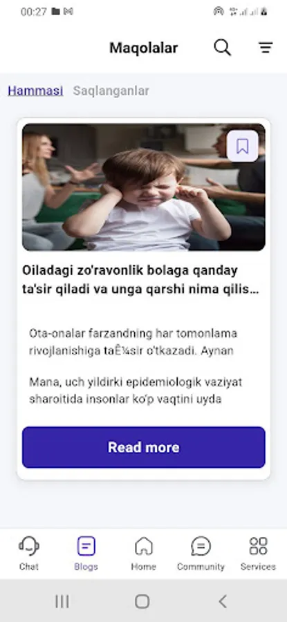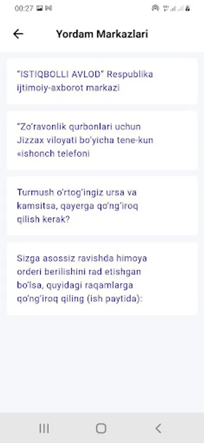 Ilovada xavf tug’ilganda yaqinlariga tezkor xabar berish va yordam olish, oilaviy muammolar paydo bo’lganda tegishili mutaxassislardan yordam so’rash, va bir qancha foydali xususiyatlardan tashkil topgan.