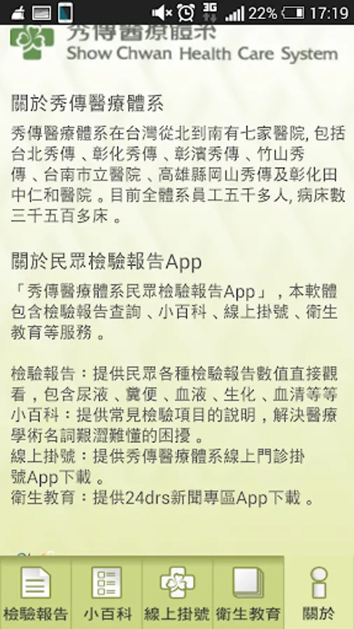 秀傳醫療體系在台灣從北到南有七家醫院, 包括台北秀傳、彰化秀傳、彰濱秀傳、竹山秀傳、台南市立醫院、高雄縣岡山秀傳及彰化田中仁和醫院。目前全體系員工五千多人, 病床數三千五百多床。