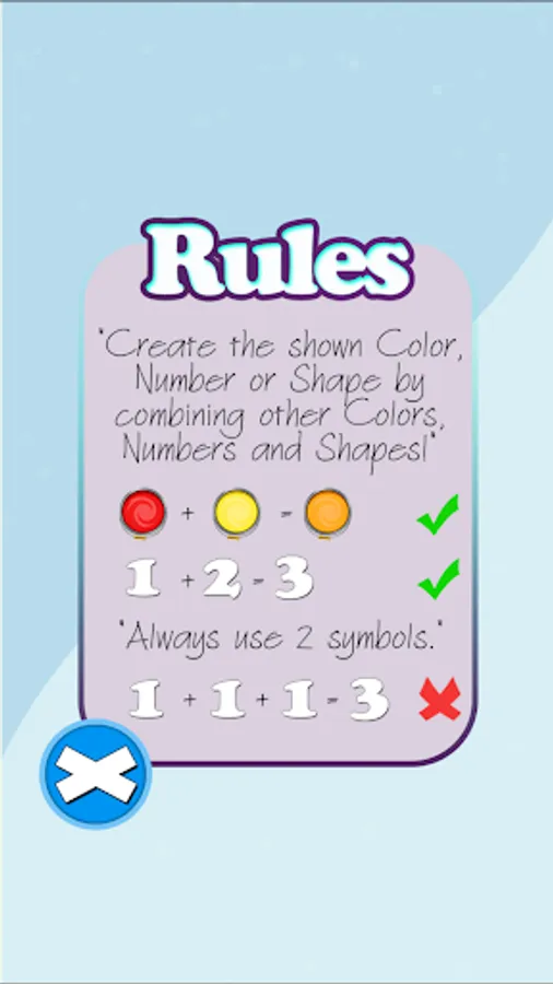 "Create the shown color, number or shape by combining other colors, numbers and shapes." "Keep in mind, always use 2 symbols!"