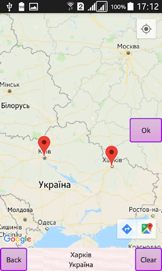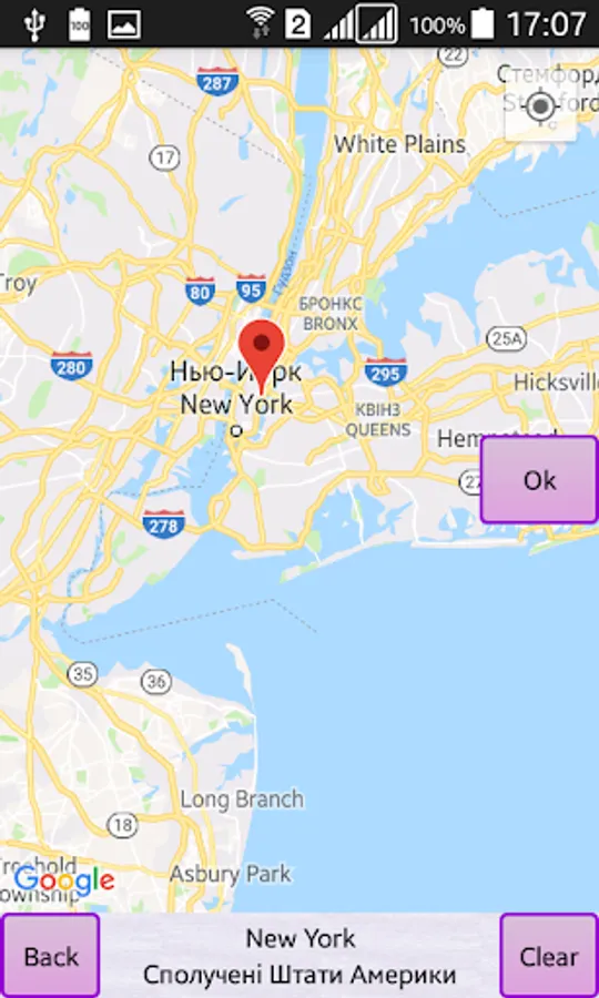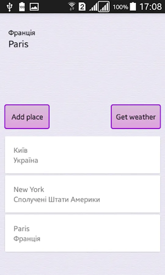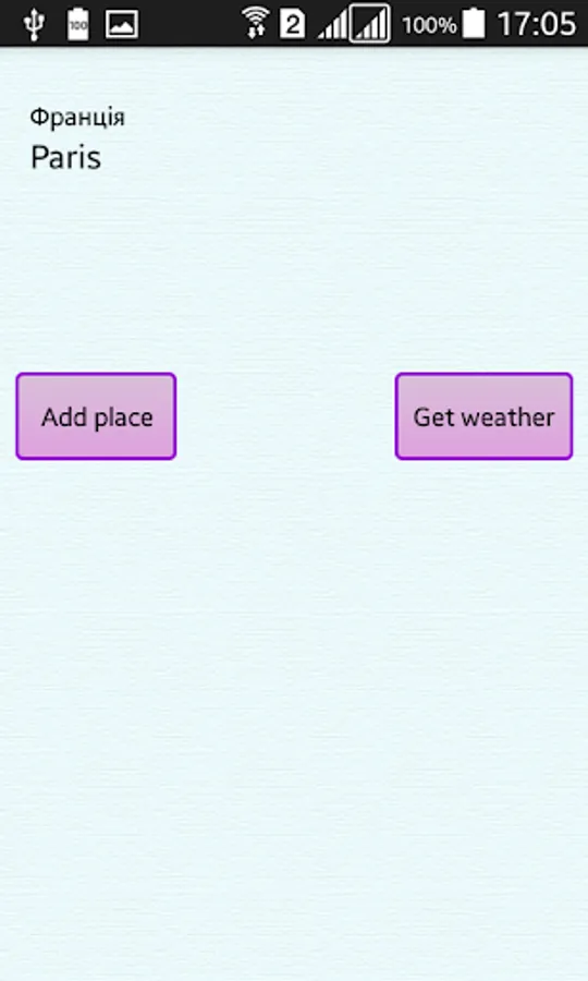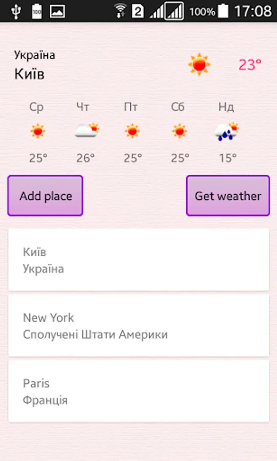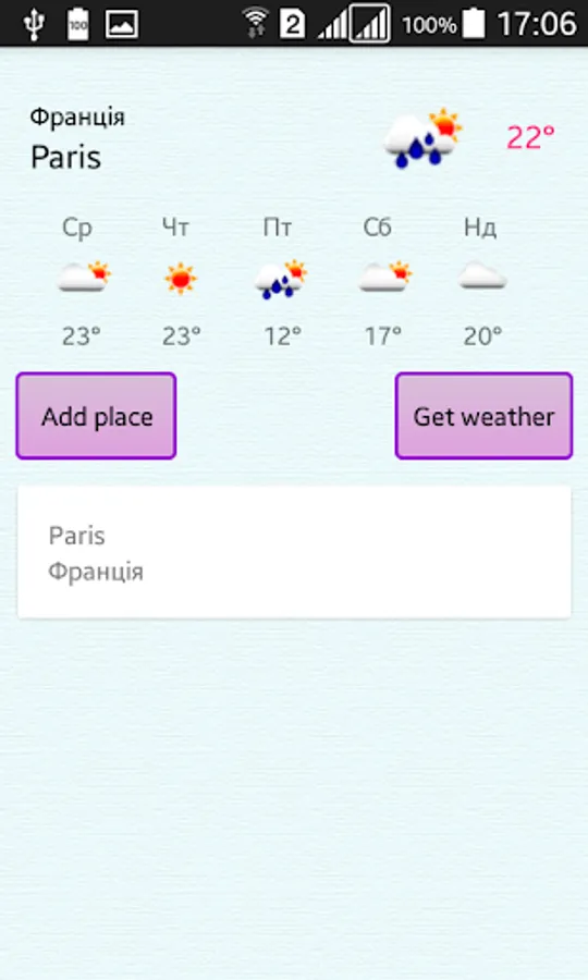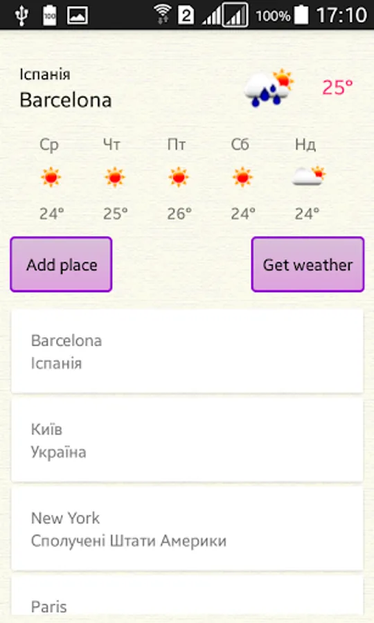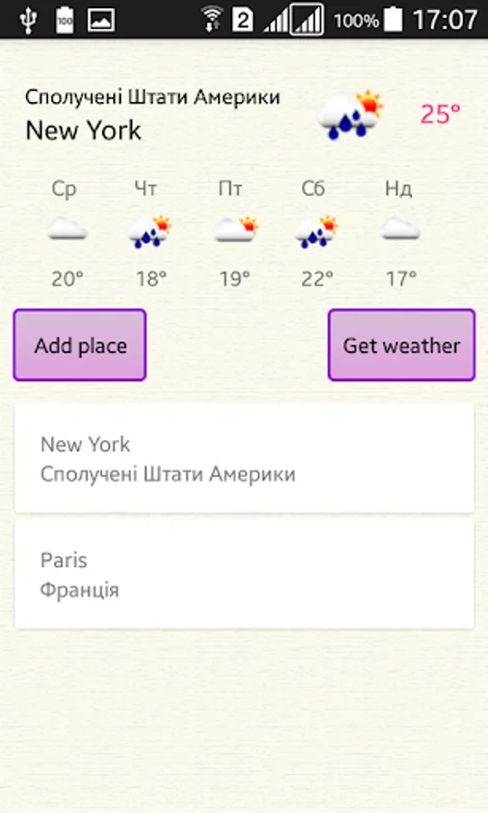 The Google map, from which data is collected, will help you find any city on the planet. After that, this city will be preserved and one click will allow you to find out what the weather is.