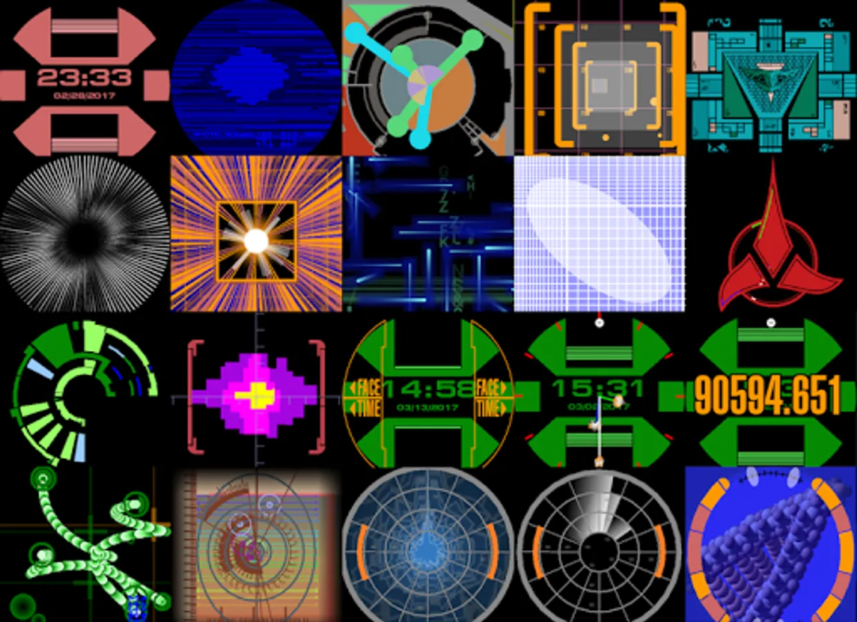 I've made a compilation of screens that run on Android Wear, letting you switch between different faces, as well as overlays to show the time/date/stardate.