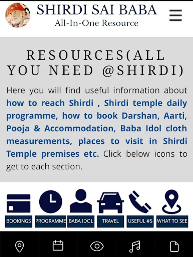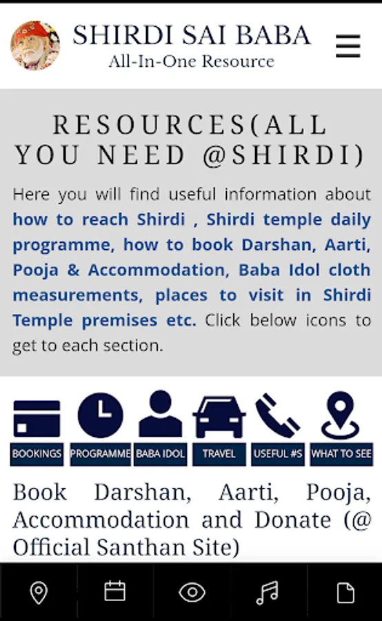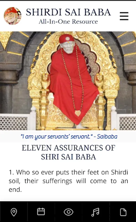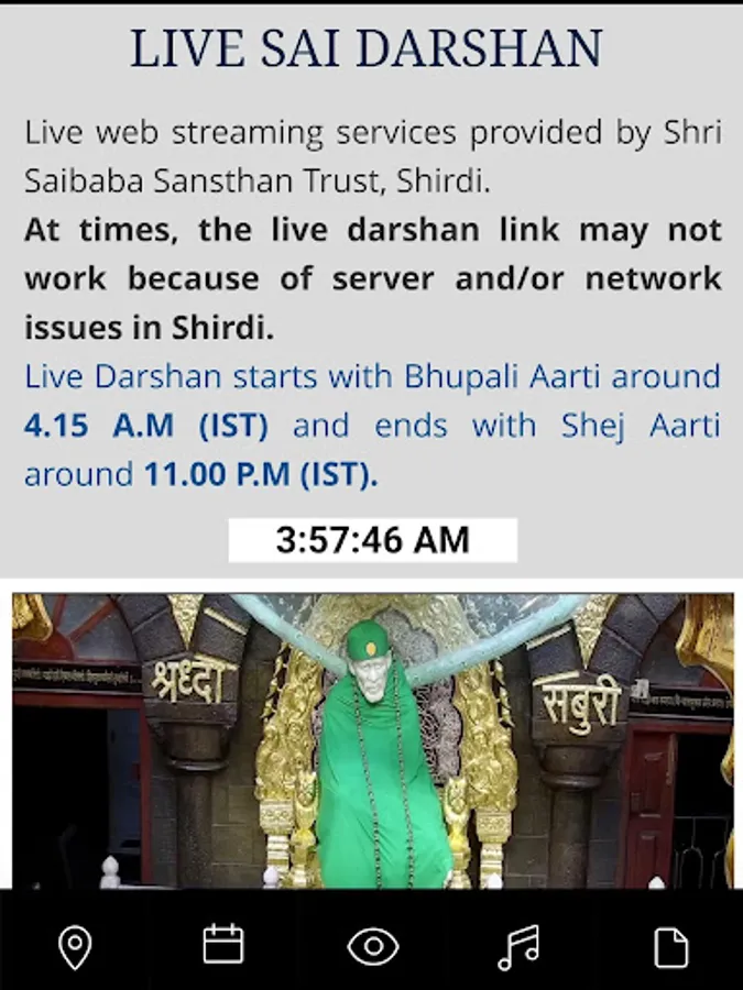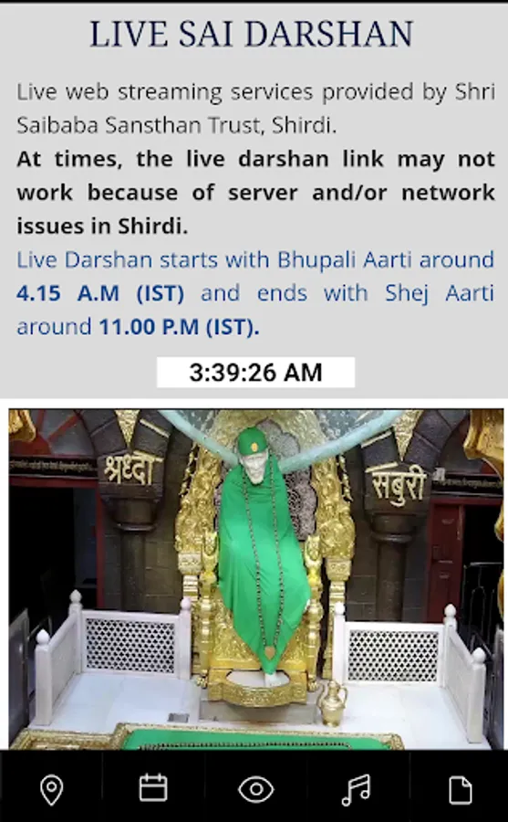 Experience Shirdi Sai Live Darshan / Shirdi Sai Baba Live Darshan from Shirdi, play / listen Shirdi Aartis, Sai Chalisa, Sai Prashnavali / Sai Answers / Ask Saibaba, Sai Satcharitra Quiz / Sai Quiz, Sai Satcharitra, Guru Charitra / Gurucharitra, Sai Namavali (108), Sainath Manjiri, Sai Vishnu Shasranama, Guru Pathache Abhang, Sai Jap and Sai Meditation. Read Sai Satcharitra, Sai Leela / Saileela maganize, Sai Vrat, Sai Nav Guruvar Vrat and Aartis in 10 plus languages. Access Sai Baba photo gallery, explore worldwide Sai Temple locations and find nearby Sai Temple(s) based on your location. Find useful information about how to reach Shirdi , Shirdi Temple daily programme, Baba Idol cloth measurements and how to book Darshan, Aarti, Pooja & Accommodation. Additionally, find emergency, other contact details.