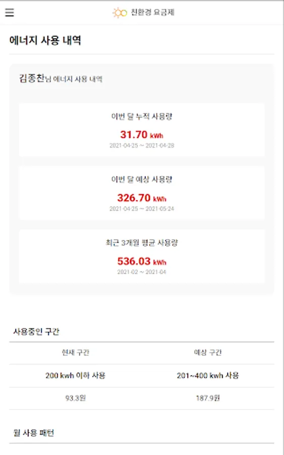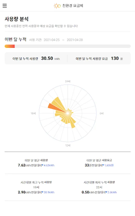 Hourly usage analysis, daily average usage analysis, expected usage this month, expected usage fee, comparison analysis of neighborhood and complex usage