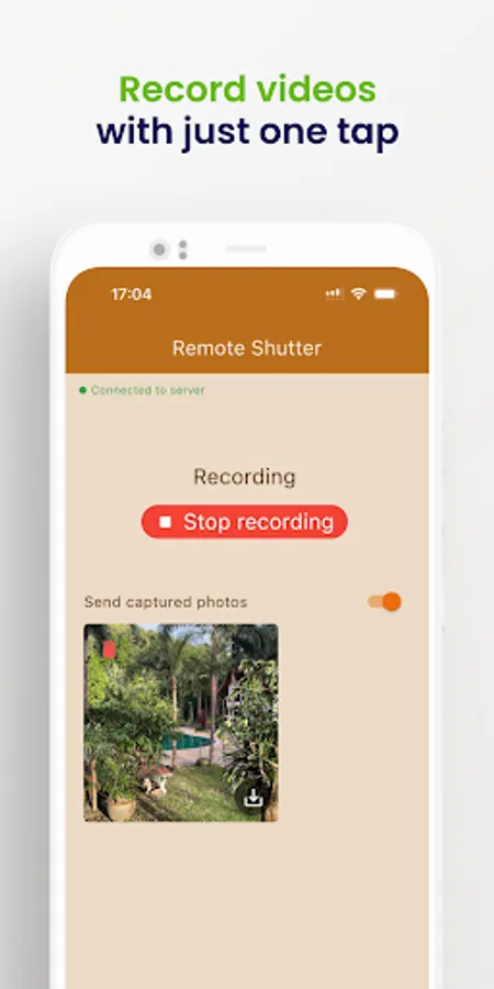 On your other device: open the app "Remote Shutter" (paid app) and tap the Photo button to trigger the camera shutter on your remote phone, or tap the Video Record button to make a video.