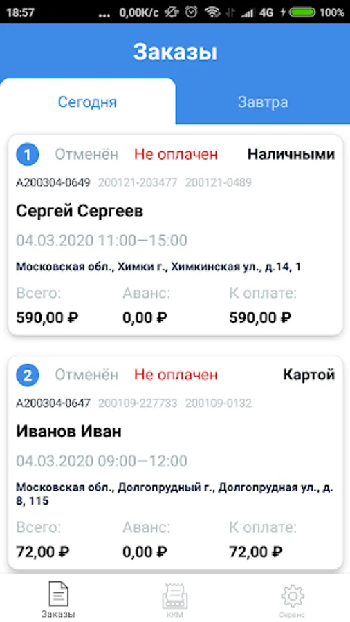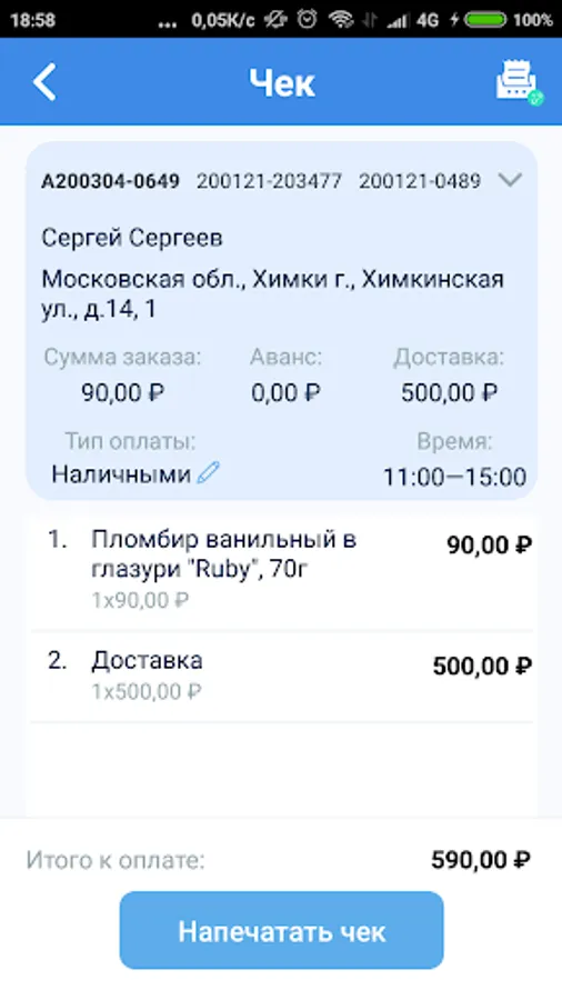 The courier allows you to view the orders assigned to the courier for today and tomorrow, and print receipts of receipts or returns for each of the orders.