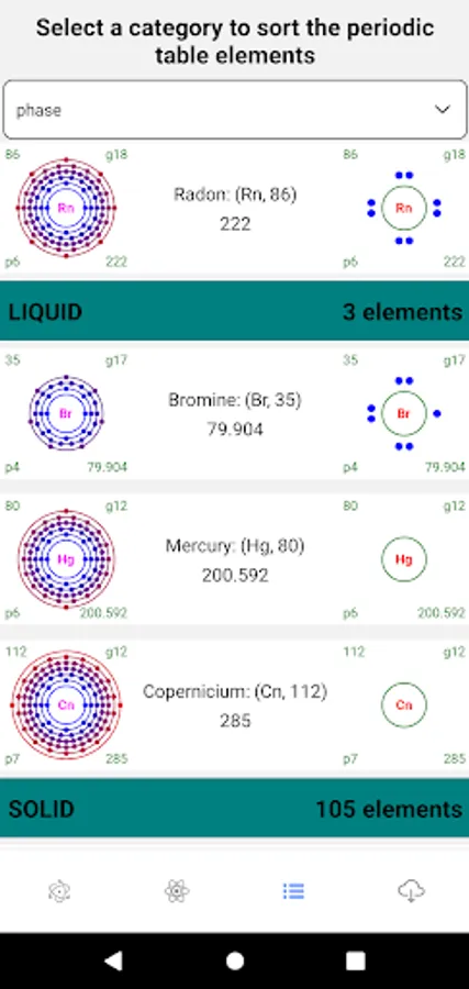 4) List that can be sorted based on different element properties like group, period, category etc.
