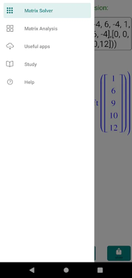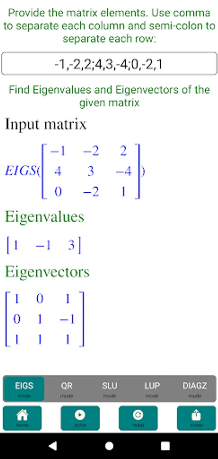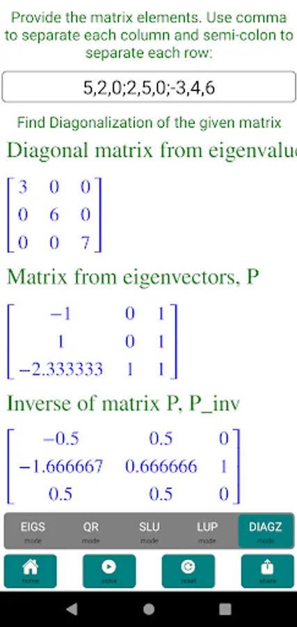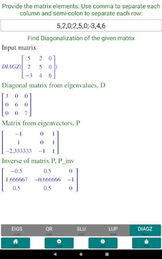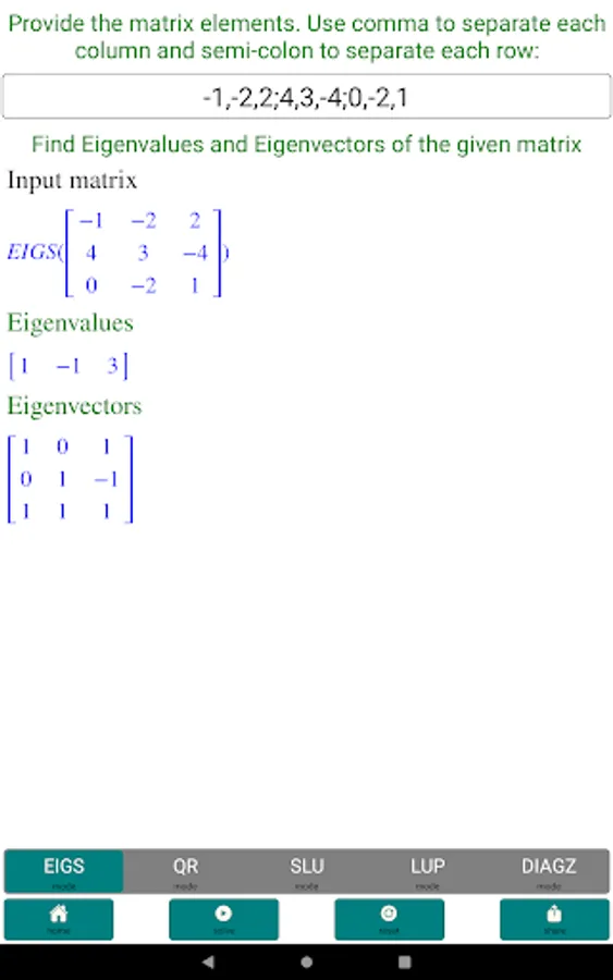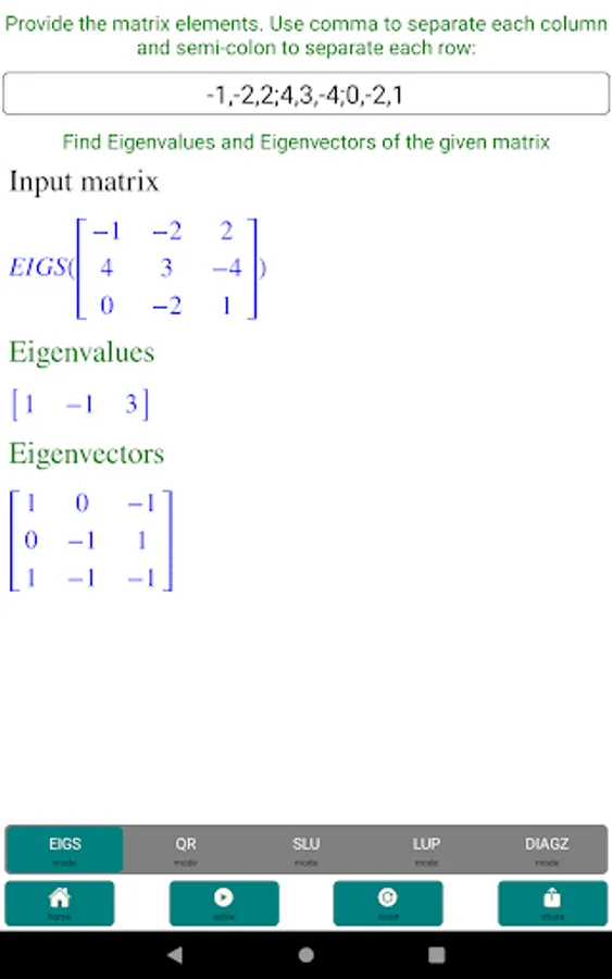 This app has tools to help you analyze matrices like finding eigenvalues and eigenvectors, diagonalization, QR, SLU, LU factorization.