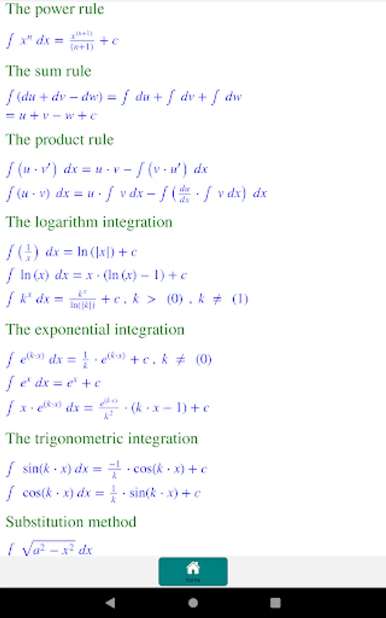 This app also has a Study page to help you learn important integration rules like, power rule, product rule, ect.