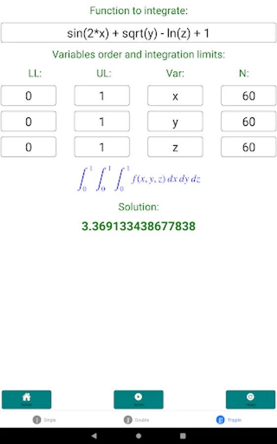 You can compute definite integral (single, double, tripple). It uses the midpoint method.
