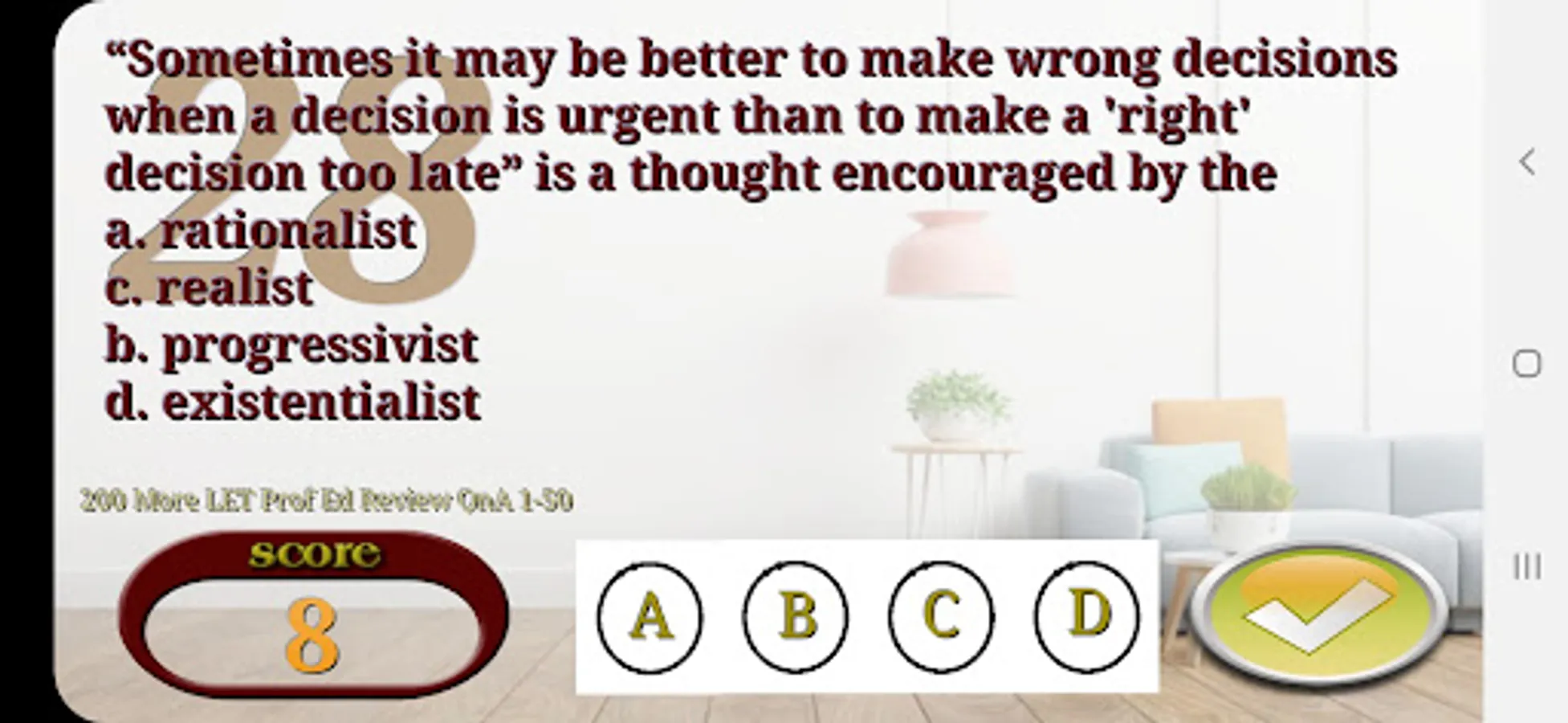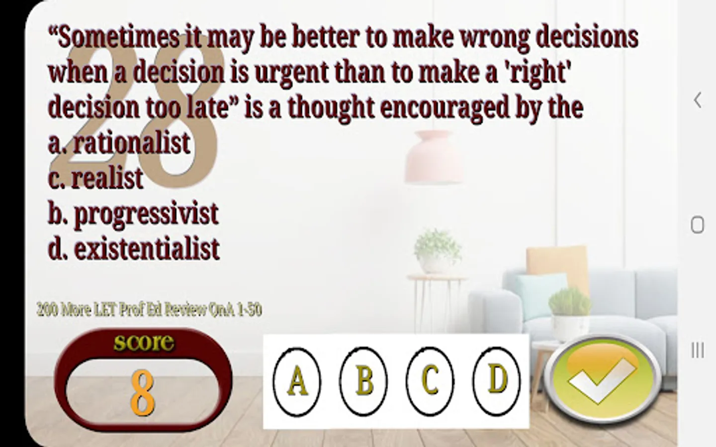 A special version of Veritee for those who are preparing for the Licensure Examination for Teachers (LET). It's an interactive quizzer/reviewer which is self-checking, has a score system, auto-reloads mistakes, and auto-returns to where you last left off. Currently, it has 1500 Gen-Ed and Prof-Ed review questions packaged into the app. Self-review anytime and anywhere with Veritee Revv LET.