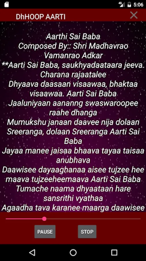 (NOTE: This app ensures that while studying the contents of Sai Satcharita and Sai vrat katha, or while active on Sai Smaran /Sai Aarti screen, the phone or tablet's screen does not lock, so that the user is not interrupted.)