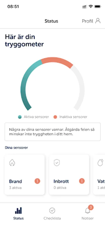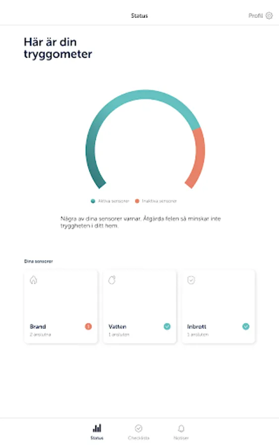 The Tryggometer shows the level of your security and gives you suggestions on what improvements you can make. It also reminds you if any of the sensors has warned of a fault.