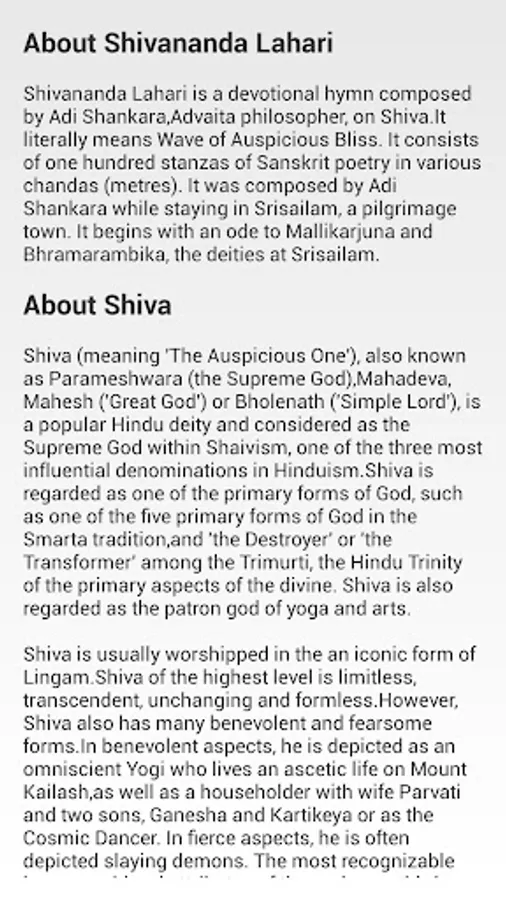 Shivananda Lahari is a devotional hymn composed by Adi Shankara,Advaita philosopher, on Shiva.It literally means Wave of Auspicious Bliss. It consists of one hundred stanzas of Sanskrit poetry in various chandas (metres). It was composed by Adi Shankara while staying in Srisailam, a pilgrimage town. It begins with an ode to Mallikarjuna and Bhramarambika, the deities at Srisailam.