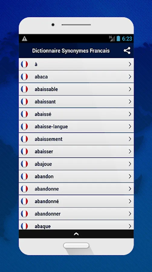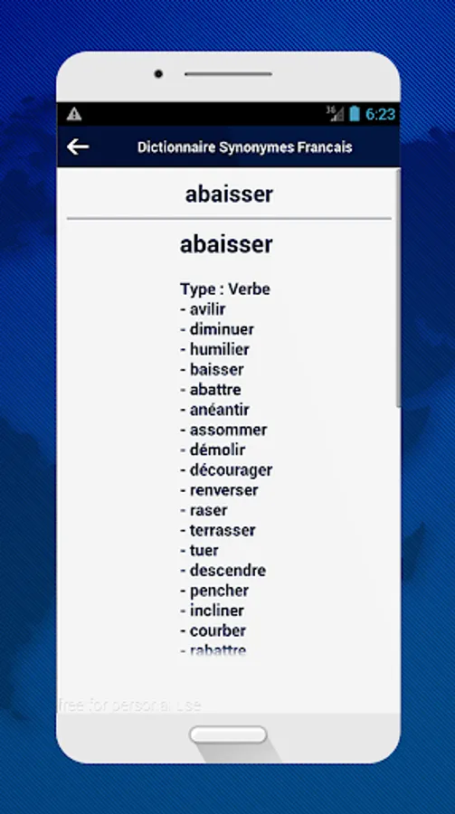 This application offers more than 52 000 words and French synonyms, find the definition you look is simple, type your term and you get the synonym for your word in French, a favorites list is also available for words often consulted and the history of your searches.