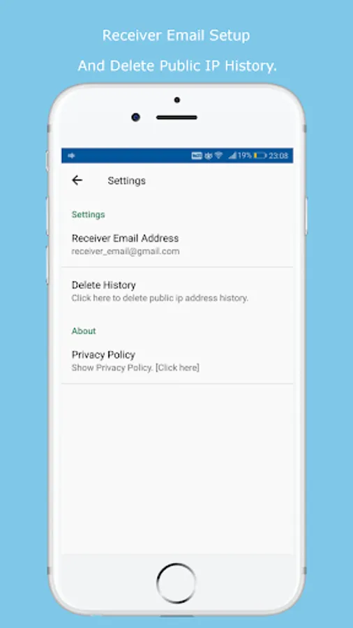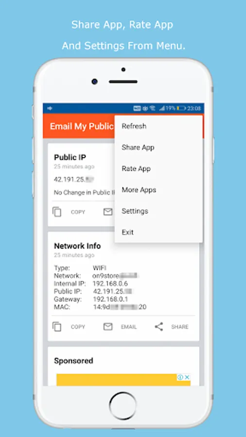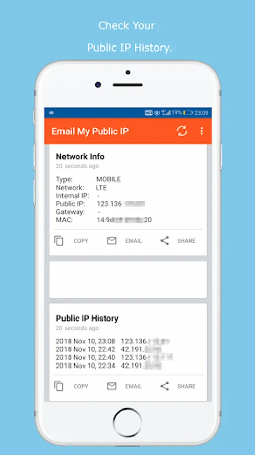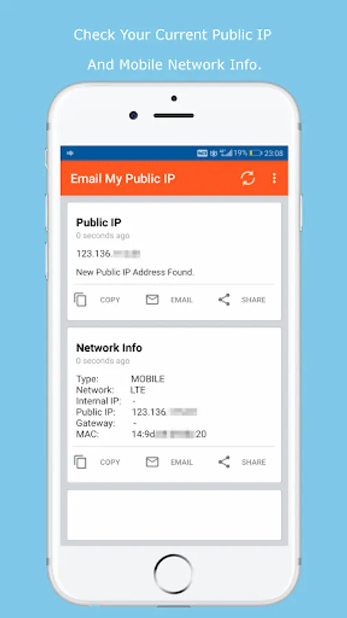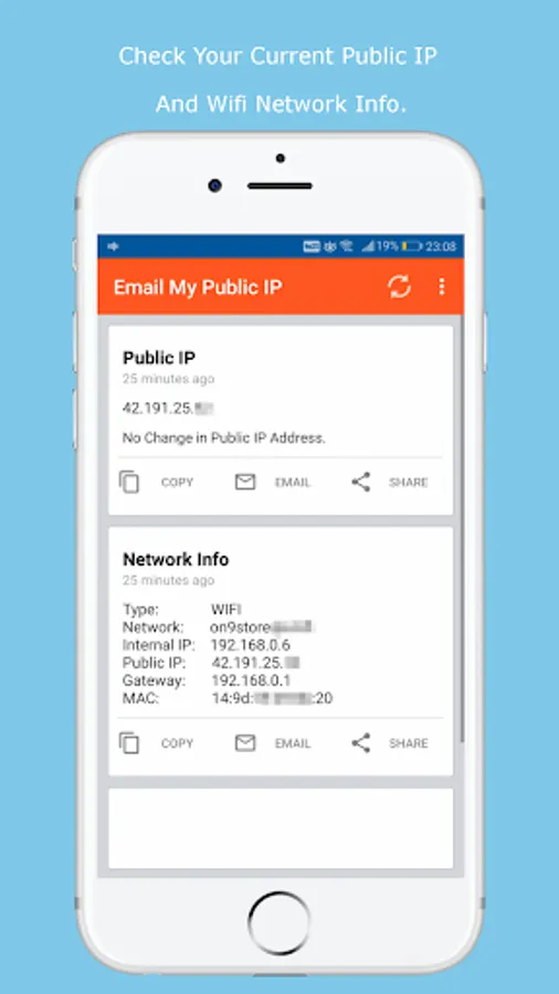 Checks and displays current Public IP Address (IPv4) and network information details with option to copy/share/send email. Support to show IP geolocation. It also keep track of public ip change and history.