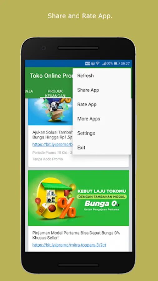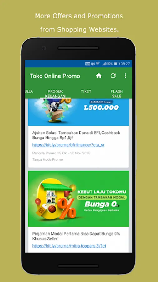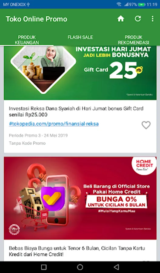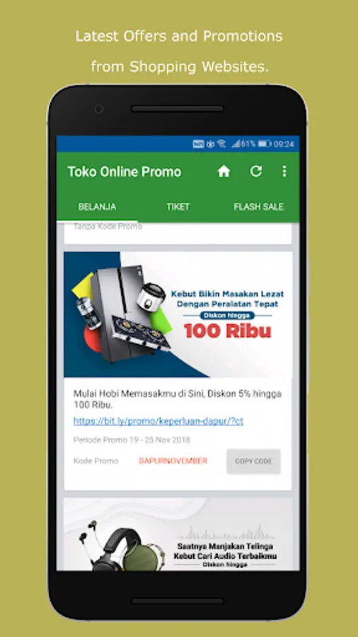 This app discovers and gathers latest highlights and promotions from Indonesia online shopping website tokopedia. Select your favorite promotion category in the setting and check out for the latest promotions.