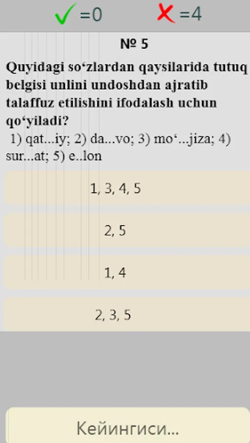 Tests in the Uzbek language for students and pupils. This appendix contains a variety of tests in the Uzbek language. Multilevel tests are designed for students and high school students.