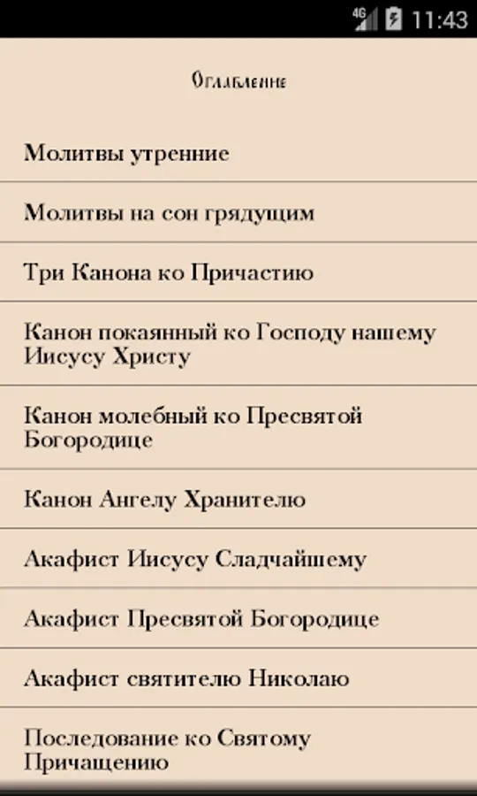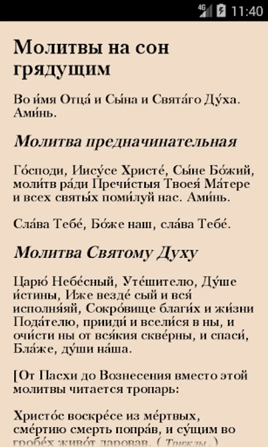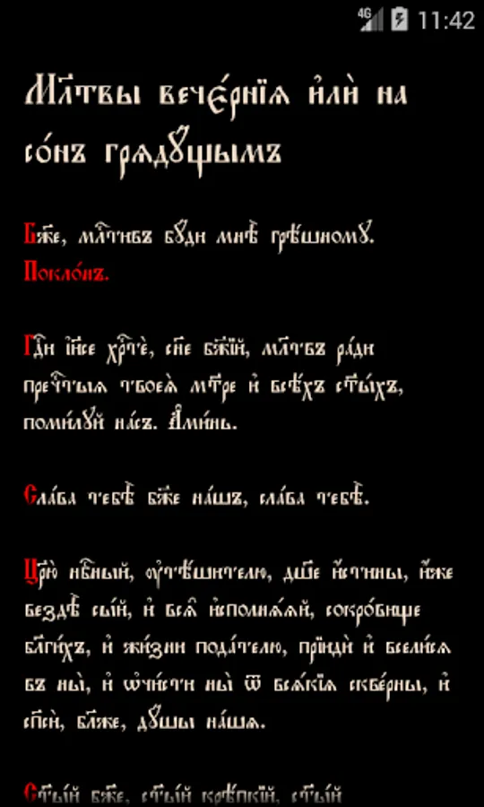 Orthodox prayer book. The application contains morning and morning prayers, as well as follow to Holy Communion in the Russian and Old Slavonic languages. In the morning hours, the automatic scrolling occurs in the morning prayers, in the evening hours - in the prayers at bedtime. The application was created with the participation of the portal Orthodoxy.ru
