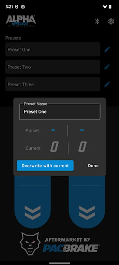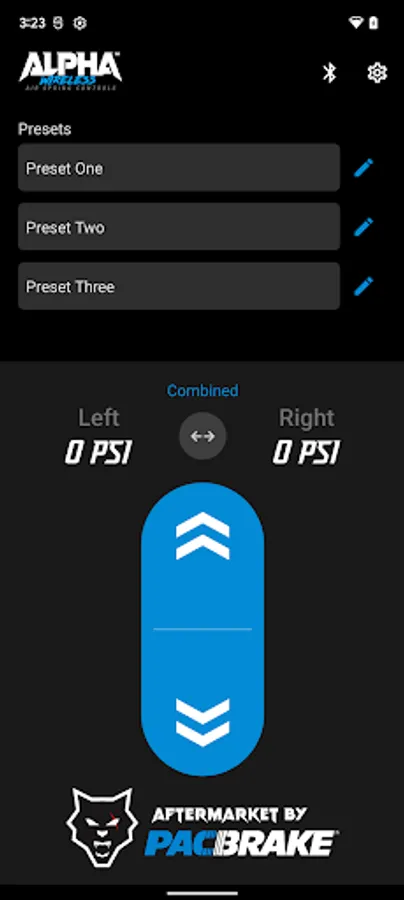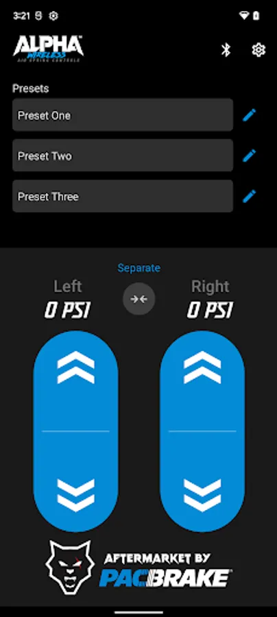 This easy to use app reads real time pressure feedback within each air spring. Additionally, it has three buttons that allow you to save presets so you can quickly achieve your desired air spring pressure. AMP Wireless Controls app works with Pacbrake's AMP Wireless Air Spring Controls (Kit number HP10316).