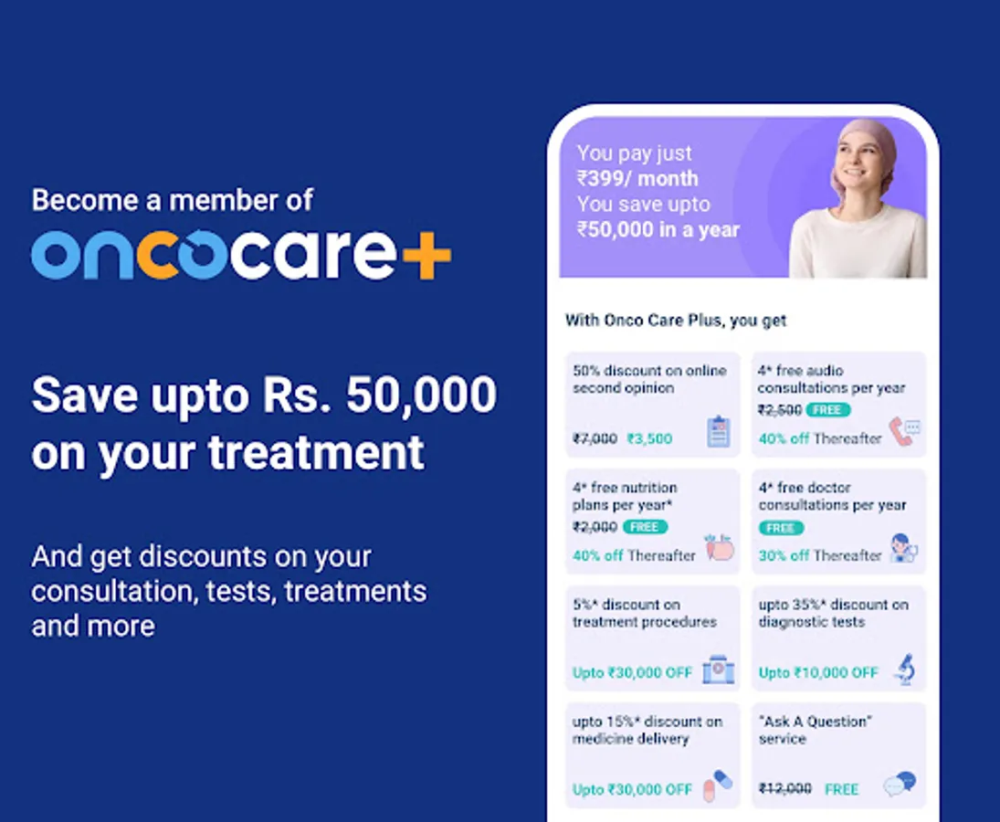 Onco Care Plus: Cut down your treatment expenses by subscribing to Onco Care Plus at a minimal fee of 399INR a month. With Onco Care Plus you save up to 50,000INR on treatment costs and get discounts on consultations, tests, and more. Over 50,000 users have trusted Onco Care Plus, subscribe today!