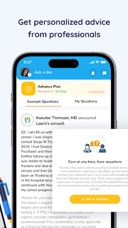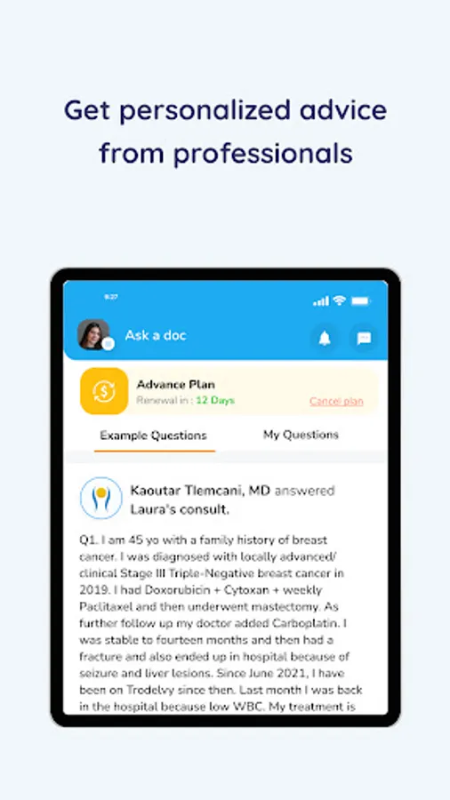 • Ask-a-Doc allows for private, personal questions to be asked to healthcare professionals (in-app subscription service, cheaper than a copay and unlimited questions)