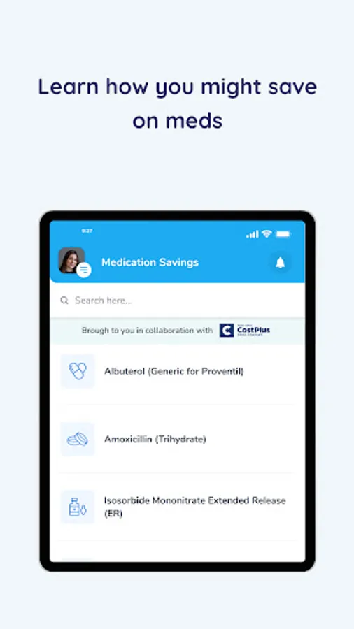 • Pill Reminder helps you stay on track with all medications and integrates with our Medication Savings suite, brought to you in collaboration with Mark Cuban Cost Plus Drug Company, so you can get the best price for your medications