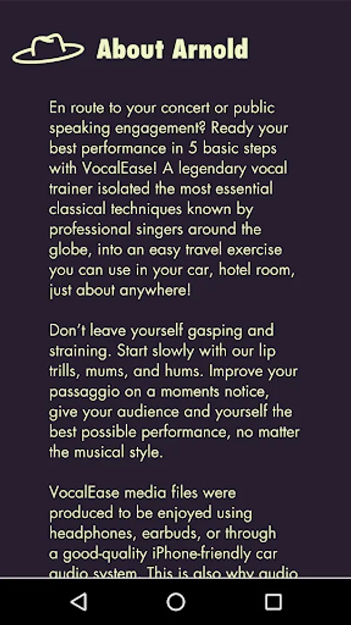 This is a vocal warm-up that now you'll always be able to access. It can never replace you teacher, but it will get you ready to work at a moments notice. Use this application for a quick prep in your home or hotel, en route to you job, or back stage before a performance or session.