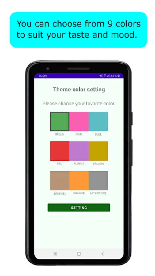 The theme color can be selected from 9 colors: GREEN, PINK, BLUE, RED, PURPLE, YELLOW, BROWN, ORANGE, MONOTONE.
