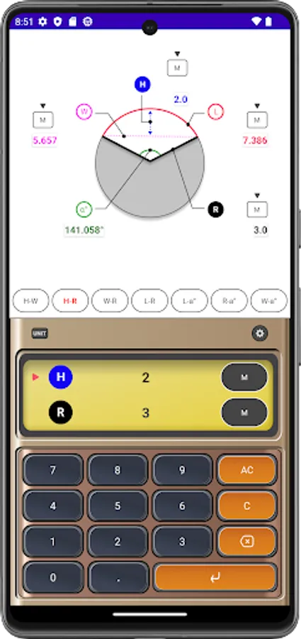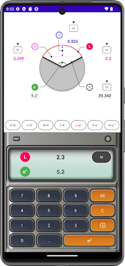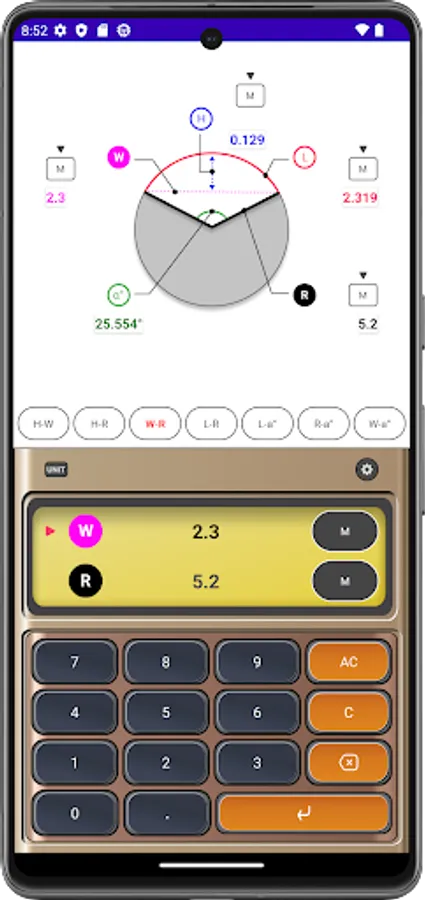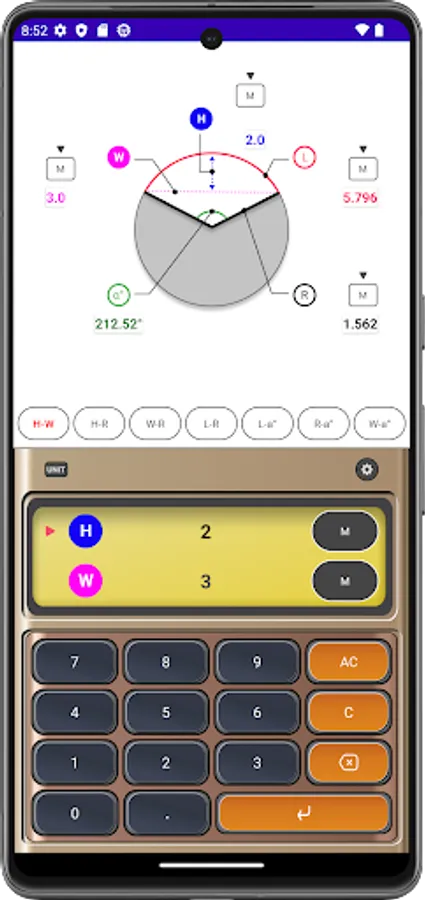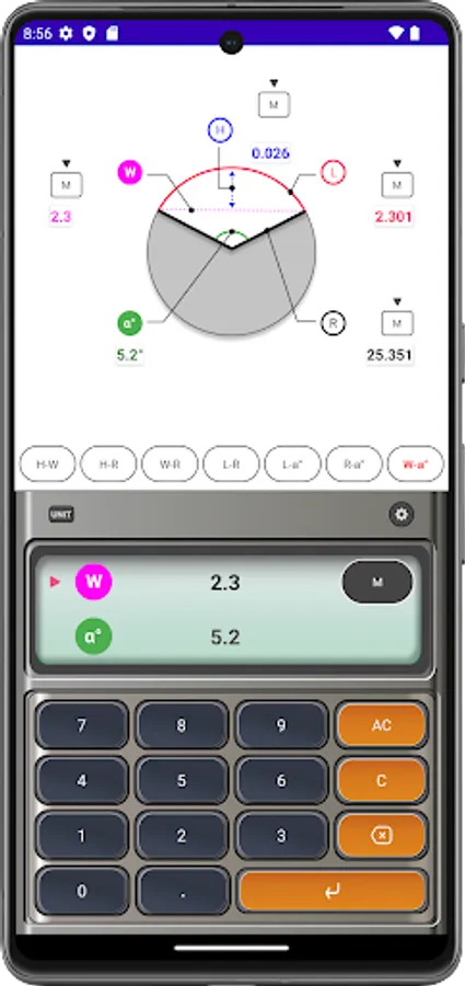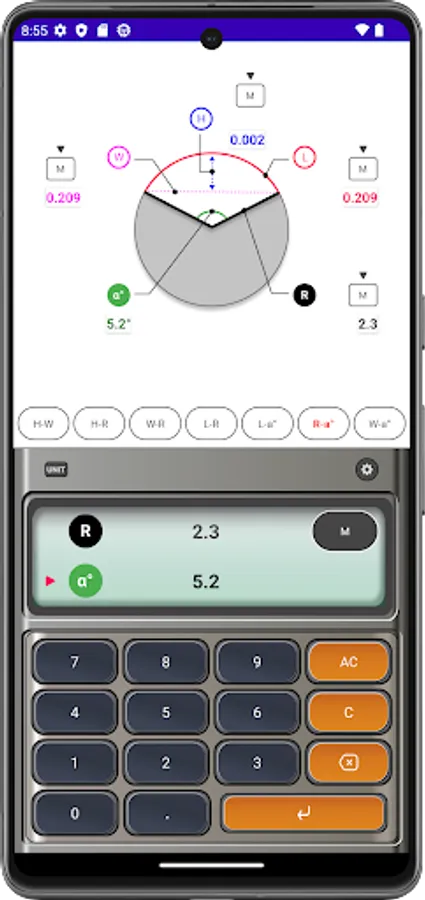 Arc Calculator is a useful calculator app for building interiors and structures. With this app you can automatically calculate arcs, radii, widths, heights and angles. In addition, sound and vibration can be generated when a button is touched, and the function to prevent the app screen from turning off can be used when set.