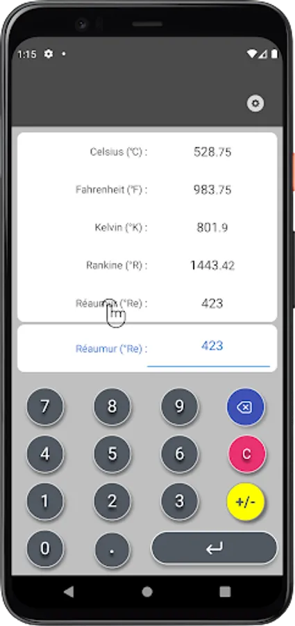 - Conversion of 5 temperature values (Celsius, Fahrenheit, Rankine, Kelvin, Réaumur)