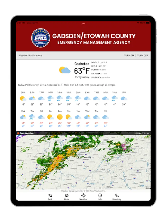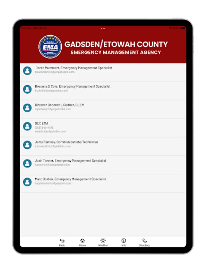 The Gadsden/Etowah County Emergency Management Agency coordinates basic disaster capabilities of all the local governments in Etowah County. The EMA is also the county's coordinating body with state and federal agencies to reassure the citizens of Etowah County are fully protected and accommodated before, during, and after disaster strikes. Tools like Shelter Etowah, Live Tower Cams, and weather stations assist in the mission as well.