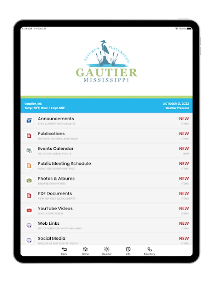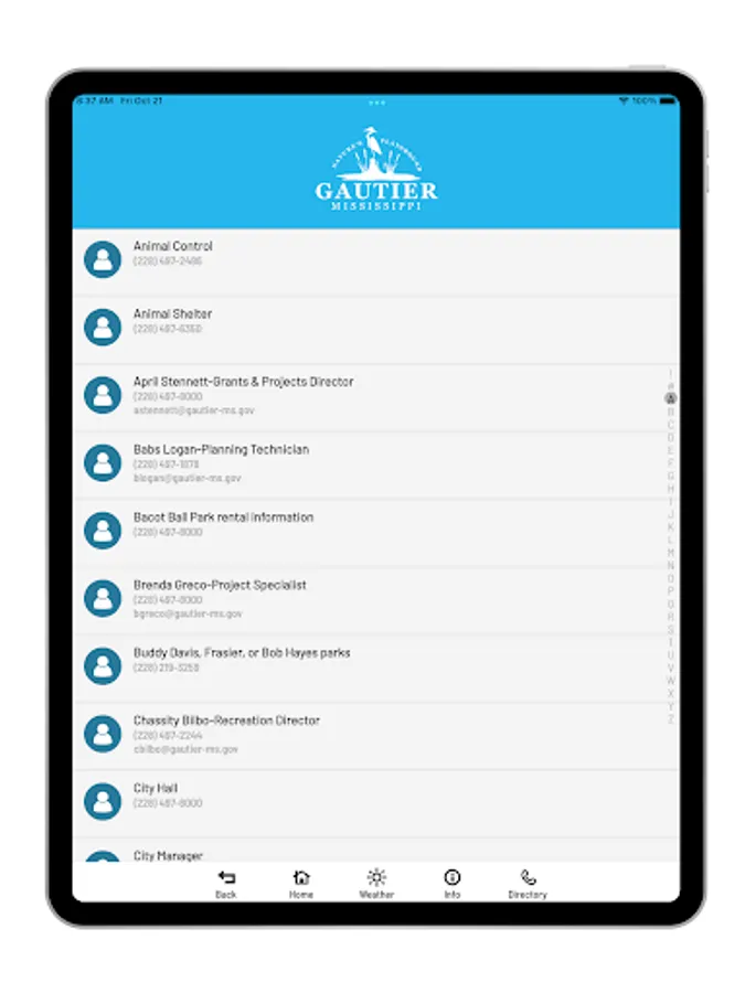 Welcome to the beautiful city of Gautier! Pronounced GO-chay or GO-shay depending upon whom you ask, Gautier is a young and growing city in the heart of the Mississippi Gulf Coast. Whether a visitor or a resident, this app is designed to connect you with all our great city has to offer. Download this app to view public meetings, receive important alerts, download forms, and much more!.
