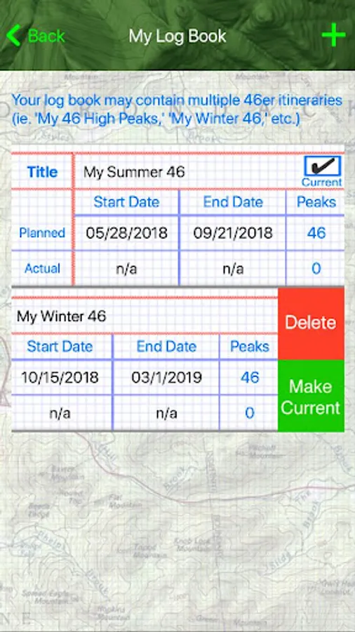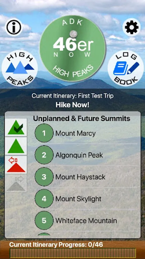 • Your Log Book: Plan an itinerary (or multiple itineraries) for summiting the 46 Adirondack high peaks. Assign planned summit dates, and automatically stamp your summits with time, date, GPS location, and current weather forecast.