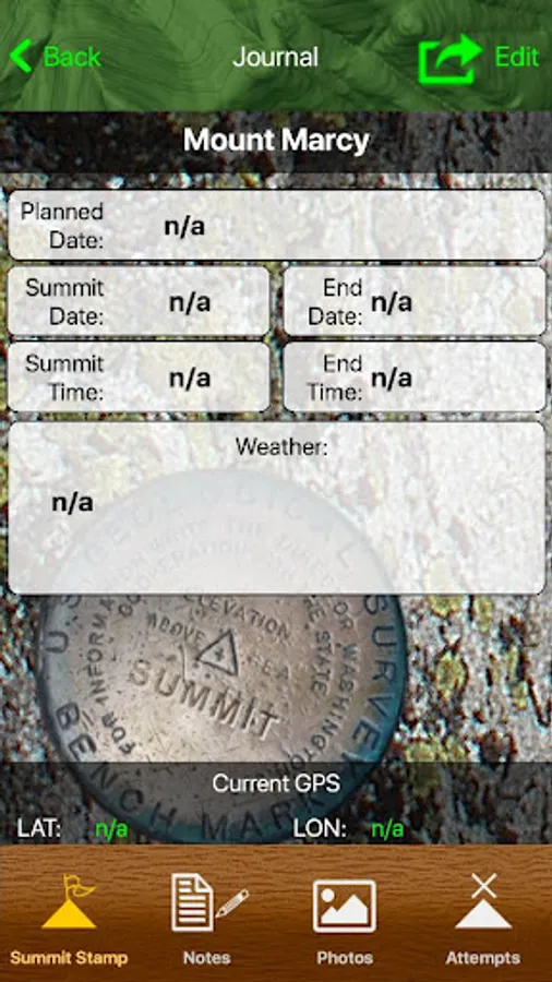 Stamp your summits by manually recording them or press a button when you reach a peak and automatically record the current time and weather forecast.